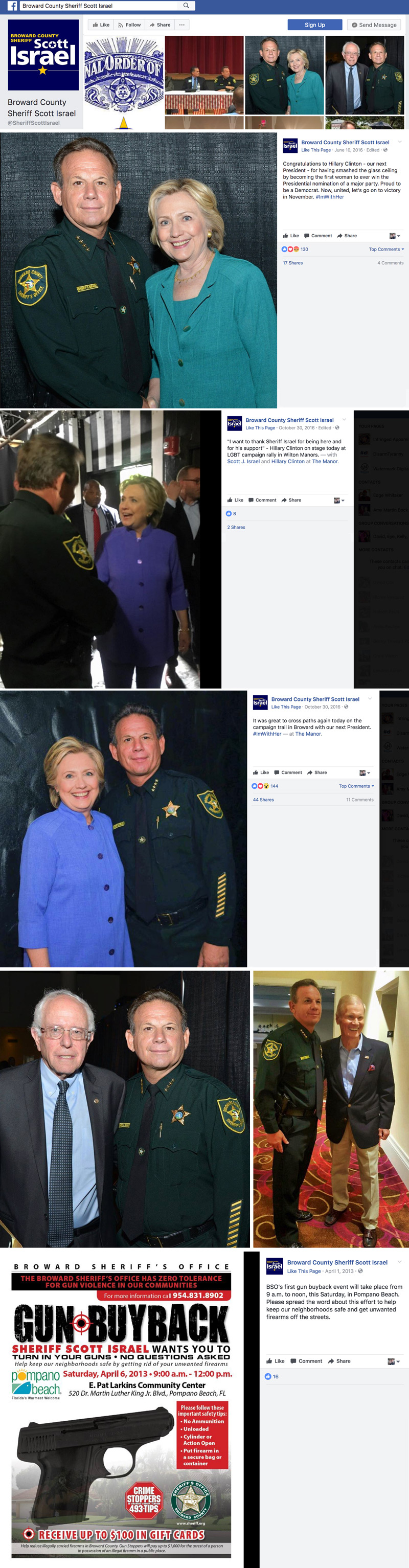 As I was writing this article the details keep coming out about this Sheriff, and none of it is looking good. Besides being someone who aspires for gun control. It’s really looking more that Sheriff Israel is even more dangerous than when I first started writing this on Sunday, February 25th. Next I want to talk about how just from his Facebook page (https://www.facebook.com/SheriffScottIsrael/) you can see him buddy buddy with some of the most extreme liberal and at least one self-proclaimed socialist... Bernie Sanders (see the pictures to the right). Openly campaigning for Hillary Clinton the criminal, herself whom should be in jail. This so-called Sheriff is nothing more than a partisan political hack at best. Some of the memes we have seen of him are quite spectacular. I want to be very clear here, and Sheriff Israel isn’t even adept at being a school crossing guard much less a deputy or sadly for the citizens of Broward County their Sheriff!